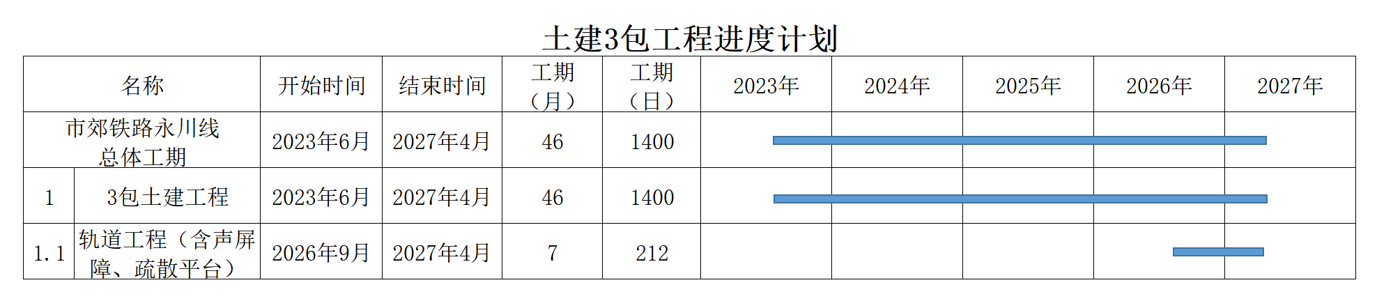 市郊鐵路重慶中心城區(qū)至永川線(xiàn)工程計(jì)劃施工總工期60個(gè)月。本招標(biāo)項(xiàng)目計(jì)劃于2023年6月30日開(kāi)工,計(jì)劃1400日歷天按合同約定實(shí)施和完成本承包工程。