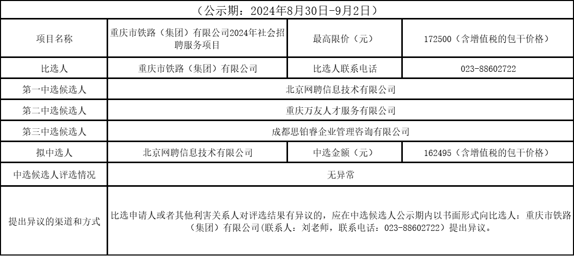 重慶市鐵路(集團)有限公司2024年社會招聘服務(wù)項目競爭性比選結(jié)果公示表