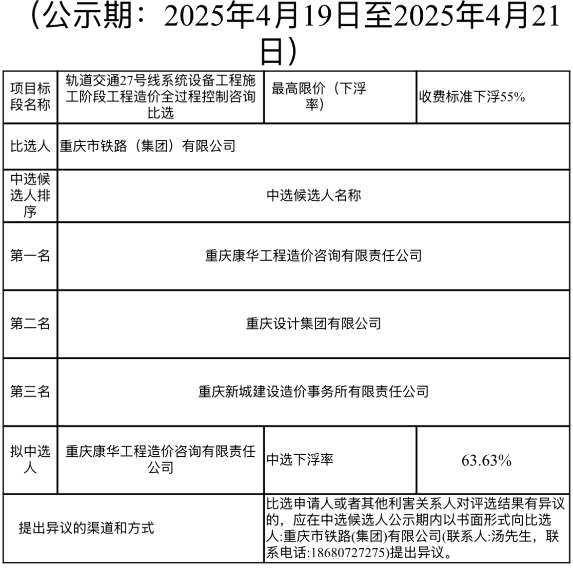 軌道交通27號(hào)線系統(tǒng)設(shè)備工程施工階段工程造價(jià)全過程控制咨詢比選結(jié)果公示