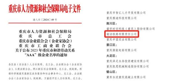 近日,重慶市人力資源和社會(huì)保障局、重慶市總工會(huì)、重慶市企業(yè)聯(lián)合會(huì)(企業(yè)家協(xié)會(huì))、重慶市工商業(yè)聯(lián)合會(huì)發(fā)布了《關(guān)于公布2023年重慶市和諧勞動(dòng)關(guān)系“AAA”級企業(yè)名單的通知》(渝人社〔2024〕49 號),表彰了一批有力維護(hù)和諧勞動(dòng)關(guān)系、切實(shí)保障職工權(quán)益的優(yōu)秀企業(yè),市鐵路集團(tuán)南涪鐵路公司榜上有名。